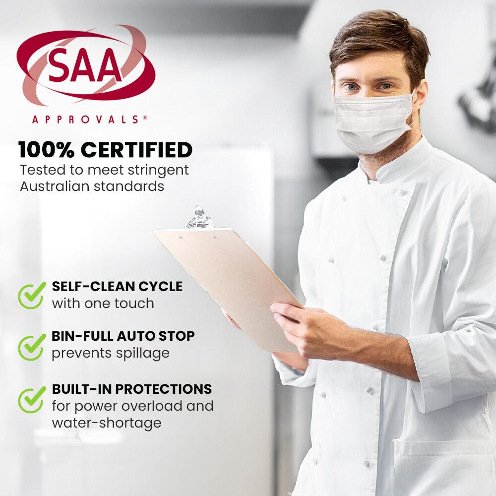 Maintenance is simple with the self-cleaning function, and an internal light provides added visibility. Adjustable feet ensure stable placement on any surface. With SAA plug, 2.2m cable, and WaterMark approval, installation is straightforward and fully compliant.