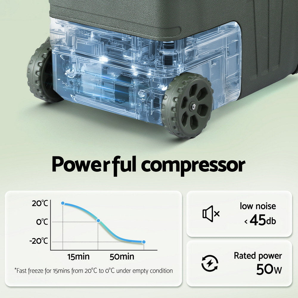 In the market for a portable fridge or freezer? Our exceptional Portable Fridge/Freezer is one cool device with extraordinary performance. Perfect for use on the road or indoors, the fridge easily plugs into any 12V, 24V or 240V power point for the powerful compressor to kick in its cooling prowess. A simple LCD with even simpler operational setting allows you to start the refrigeration process easily: just turn on the power, set the temperature, and the genuine compressor will do the rest. The compressor is very energy-efficient,offering ECO and MAX cooling modes about 1.32kWh for every 24 hours of use. When running on DC power, the battery has 3-stage charging protection that cuts off charging once the voltage setting is attained to ensure longer-lasting battery life. The fridge has plenty of space for all your food and drinks with removable divider that also serves as a cutting board, and you can adjust the temperature down to -20 ?. The heavy-duty exterior is designed to handle all the knocks and bumps of a road trip and comes with 4 cup holders on the top lid, plus easy carry handles,pull rod and off-road wheels for portability. With so much going for it, our Portable Fridge/Freezer is surely your choice of a reliable cooler for all your outdoor (or indoor) escapades.