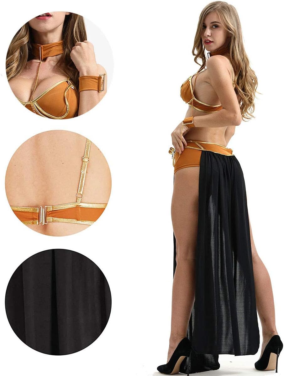- 【WIDE APPLICATION】Perfect for cosplay party, bedroom role play, nightclub wear and so on 【4 pieces】A set of 4 pieces: bra + panties + long skirt + collar and chain 【Captivating body curve】Perfectly highlights your captivating body curve 【Quality material】Made of high-quality milk fiber and mesh material, soft and breathable 【More than expected】Instantly make you sexy more than you expected
