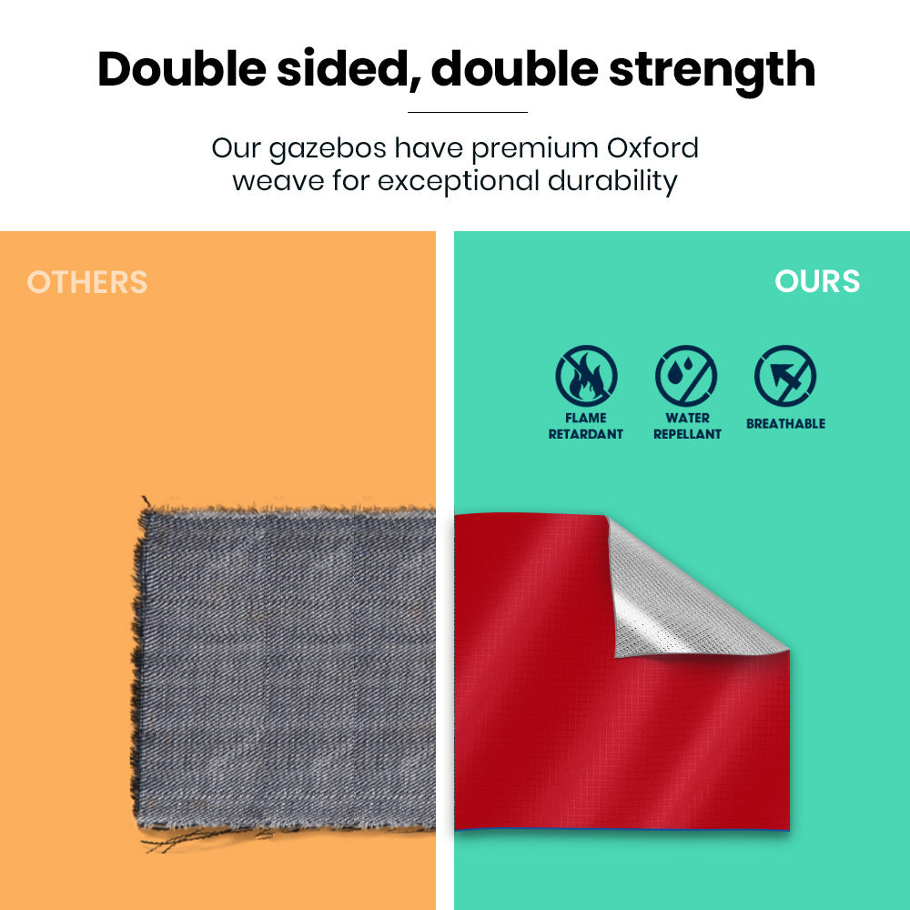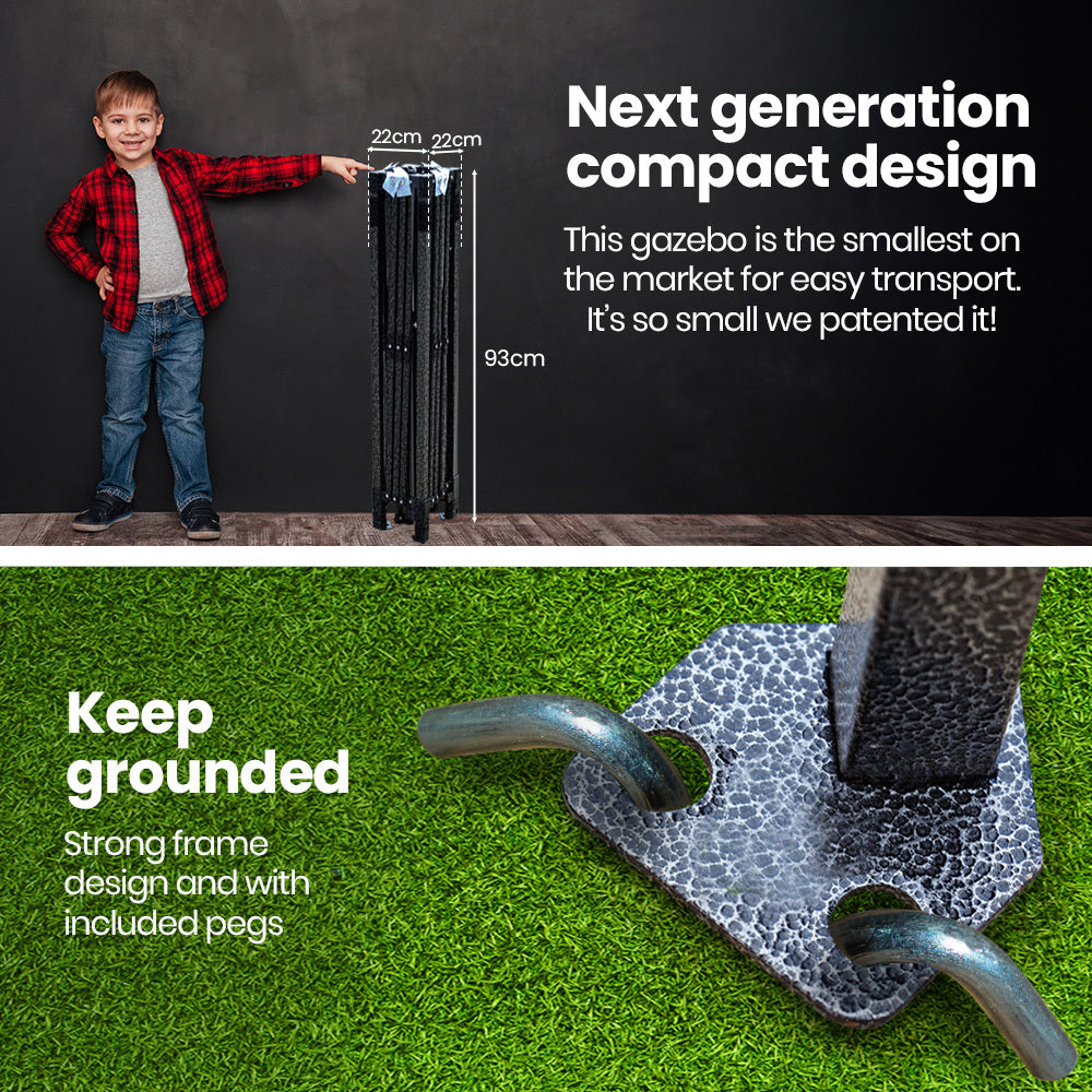 The Red Track 3x3m Gazebo (with 3 walls included) stands out with the smallest folded size on the market—just 93cm long! This ultra-compact 13kg design makes it incredibly easy for one person to carry, transport, and store, offering unmatched convenience compared to bulkier alternatives. Whether you're short on space or always on the move, this gazebo’s design ensures portability without compromise.