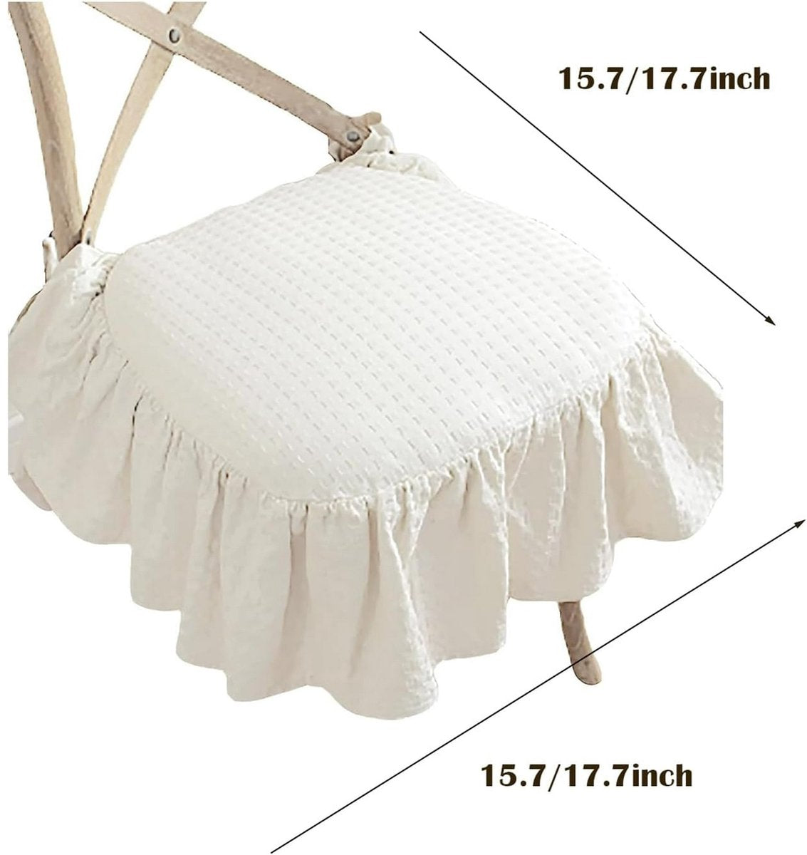 The newest addition to our Farmhouse Collection is the Ruffle Chair Cushion. This thoughtfully designed cushion is perfect for impressing your guests at dinner parties and elegant gatherings. Its classic, rustic design blends seamlessly into any interior. The cotton seat offers ultimate comfort, even with extended use, and the removable, washable cover makes maintenance easy. This versatile cushion can be used as a dining chair cushion or as a table and chair cushion! The Ruffle Chair Cushion is stylish and modern, breathing new life into your interior. Available in a variety of classic colors, you're sure to find the perfect match for your table, chairs, or sofa. The cover is made of high-quality cotton for durability. Material: Cotton + Polyester Dimensions: 15.7/17.7 inches Usage: Living room, bedroom, office chair, garden, patio, seat cushion, decorative pillow, hip cushion, back cushion, and home decor. Show more
