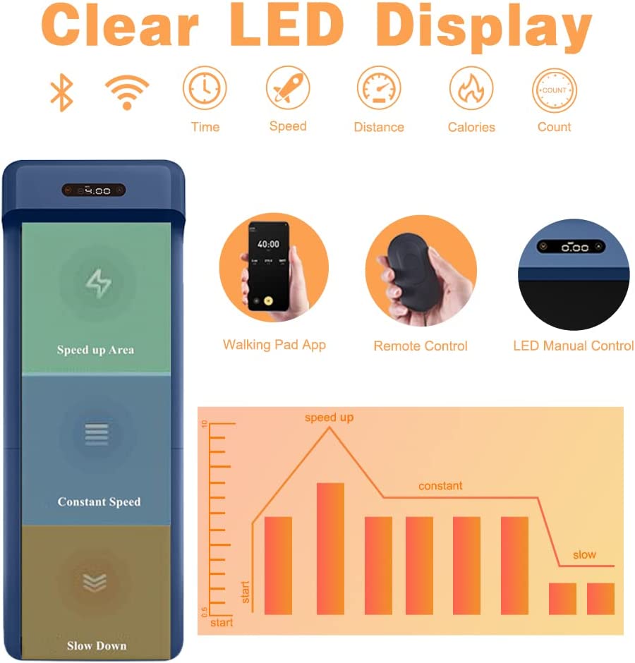 Smart Gravity Foot Sensing Speed Control: To avoid fall down risk on the speed walking pad, this foldable treadmill C2 is built with highly sensitive gravity sensors to support speed control, you will easy to feel the front accelerate area, middle uniform speed area and back decelerate area, and the whole process is automatically controlled by your foot position.