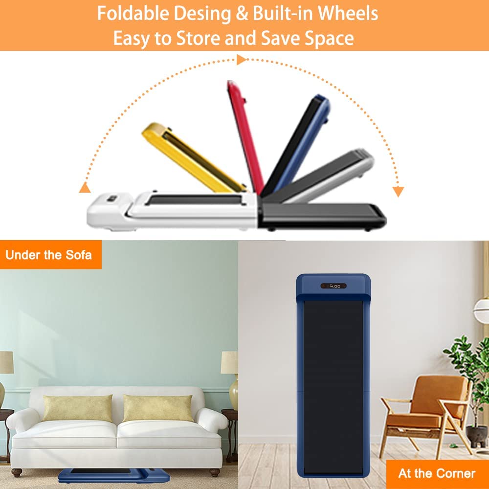 Compact, Convenient, Space-saving, Portable and Safe--- 13.6cm thickness when folded, 25kg lightweight, only covering less than 0.05_ small space in your living room or office. Compact, foldable, and wheels under the treadmill make it easier to put away after use. Lightweight, portable, and very low & slim profile, making it easy to store in a closet, under a bed, sofa, or standing desk which you can work and walk at the same time. A great Walker for home walking or jogging fitness exercise.