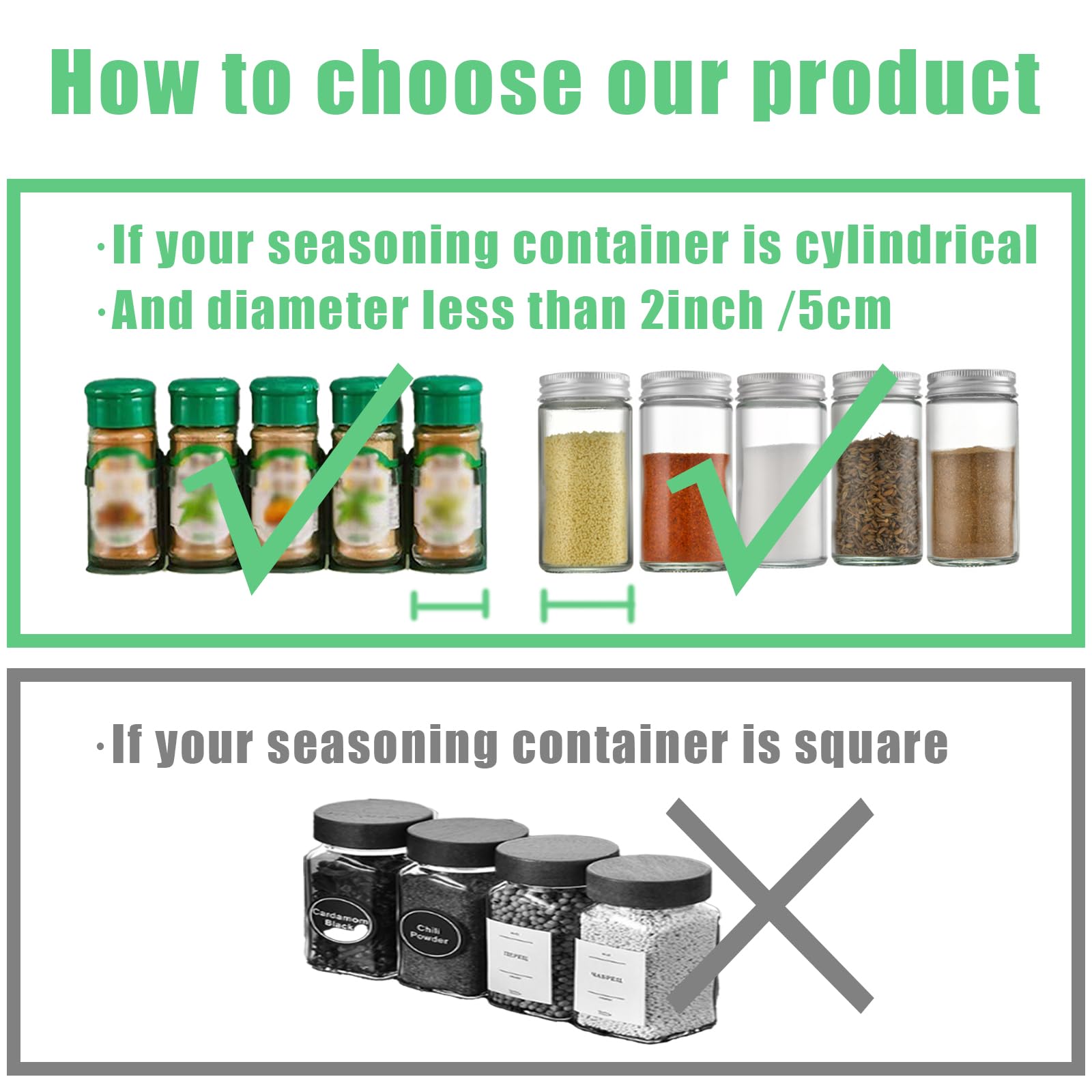 Packaging SizeOur spice clips with bottom supports provide two rows of organized storage, with 5 clips in each row. This design securely holds up to 10 spice jars, each with a diameter of 1.52 inches 3.815.08cm.