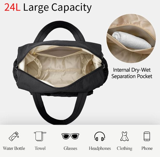 The padded women's sports bag has a capacity of 24 litres and measures 39.4 × 20 × 32 cm (L × W × H), weighing only 580 g. Equipped with 9 storage compartments, including a special wet compartment for sweaty clothes or towels, keeping wet and dry items separate.