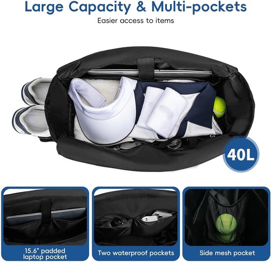 This tennis bag features separate front and back compartments, suitable for 2 tennis rackets or up to 4 pickleball rackets. The large main compartment offers ample space for shoes, clothes, sports accessories and even a laptop up to 15.6 inches. Ideal for sports and everyday use.