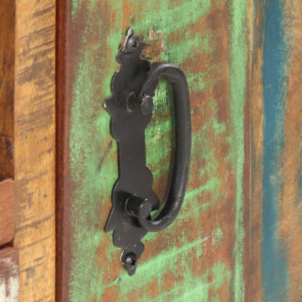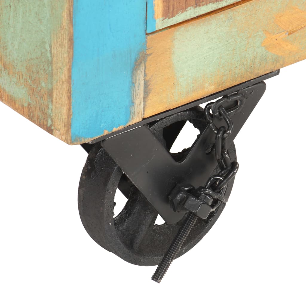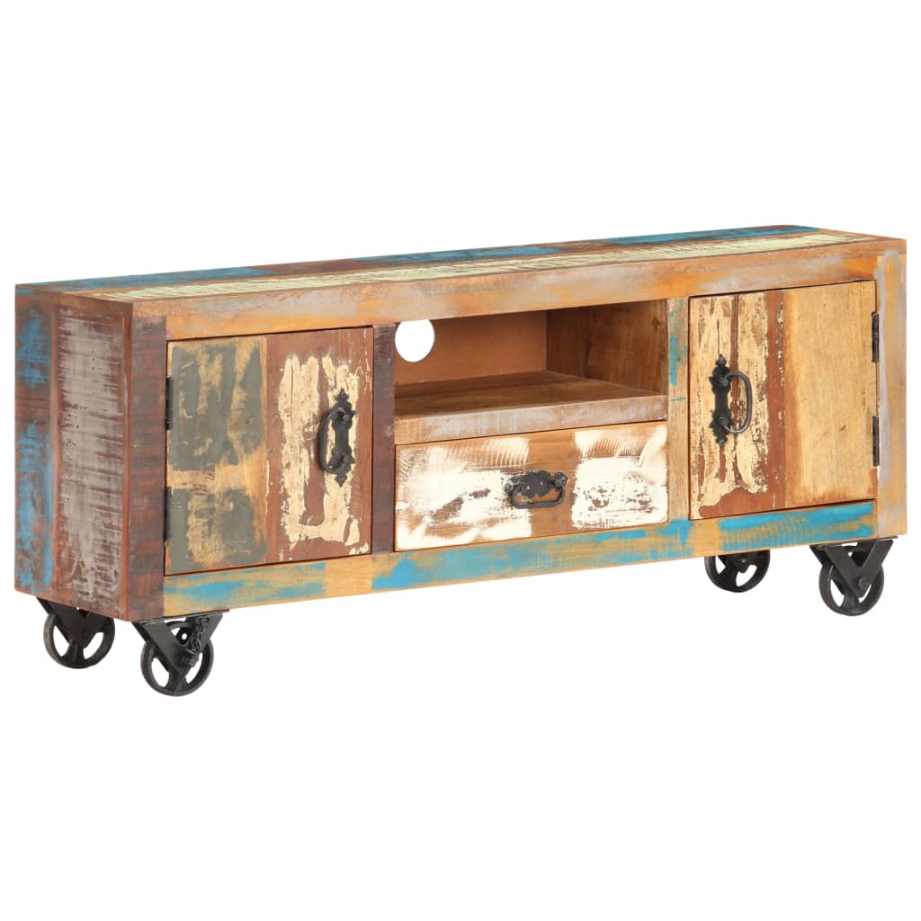 Equipped with 3 compartments and 1 drawer, our vintage-style wooden TV cabinet not only acts as a striking decoration in your interior, but also offers ample storage space to maintain your items in great order. This TV stand is made of solid reclaimed wood, which means it has the characteristics of different woods like pinewood, teak, oak, mango wood, acacia, etc. Reclaimed wood is already aged, weathered and dried so that it doesn't shrink or bend. Signs of wear and delicate wood grains make every piece slightly different from each other. Every step of the process is carried out with the greatest care, be it polishing, painting or lacquering. Additionally, you can move the hifi cabinet easily with its featured 4 cast iron wheels. Important note: The colour may vary from piece to piece, making each of our side cabinets unique.
