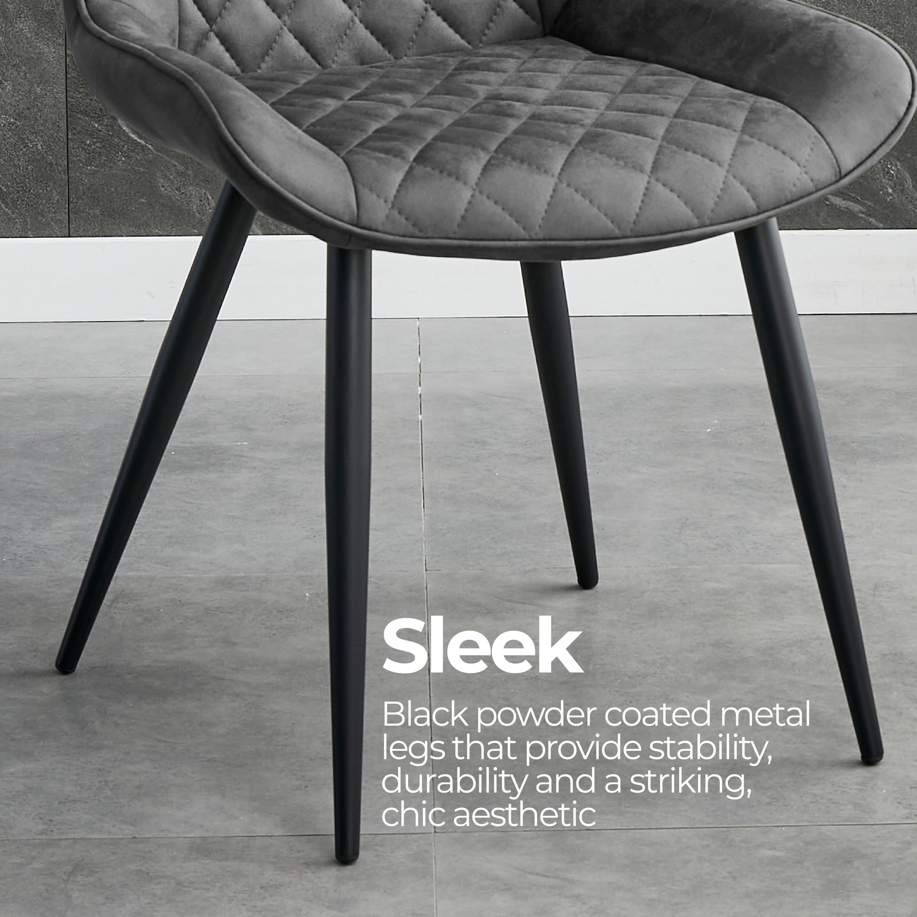 The Tyler Fabric Dining Chair effortlessly combines modern elegance with a touch of mid-century charm, making it a perfect addition to your dining area. Featuring a plush fabric, each chair is adorned with a detailed diamond quilting pattern on the backrest and seat, adding a layer of sophistication and visual interest. The soft, padded seat ensures comfort during long dinners or engaging conversations. Supported by sleek, black metal legs that provide stability and a striking contrast, these chairs not only offer a chic aesthetic but also boast durability. The Tyler Fabric Dining Chair is designed to elevate any dining space with its stylish appearance and inviting ambiance. Whether used for casual family meals or formal gatherings, these chairs are sure to impress with their comfort and design.