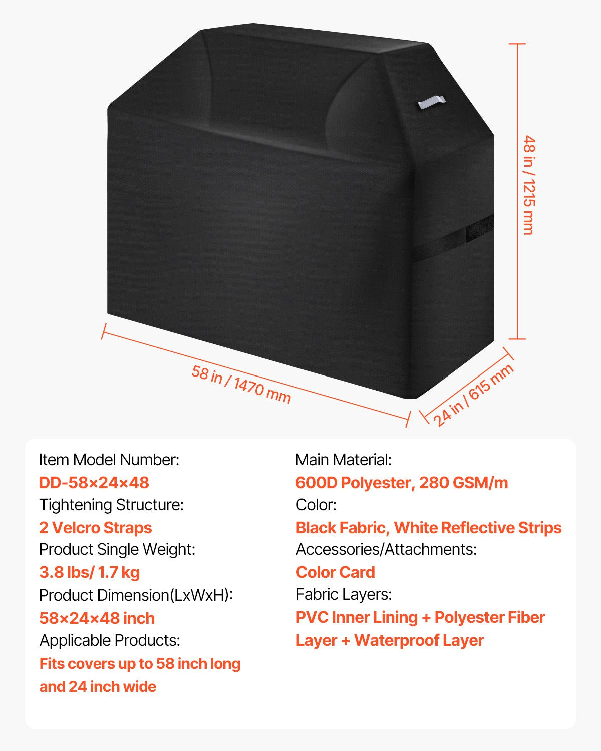 The bbq gas grill cove dimension is 58x24x48 inch / 1470x615x1215 mm. The universal grill cover fits most grills. Simply measure your grill to find the perfect-fitting cover. NOTE: This product does not include a grill
