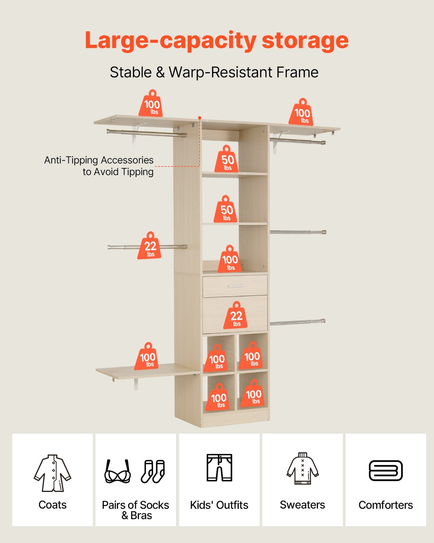 Supporting up to 800 lbs / 362.7 kg, this closet system with drawers can hold around 100 garments. Use its compartments to separate items neatly, keeping everything visible and easy to access