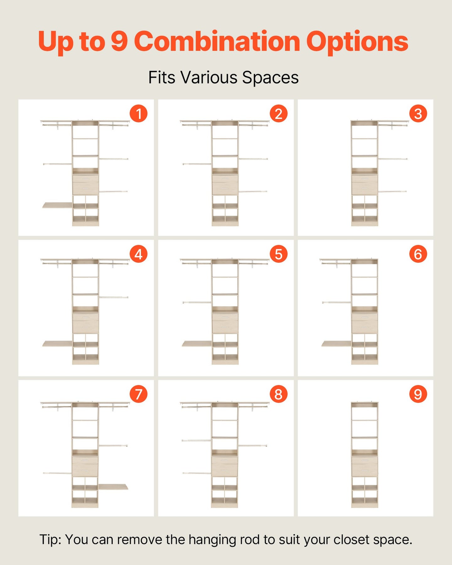 Rods can rotate or be removed to fit your closet space. Multiple layouts make it suitable for bedrooms, laundry rooms, or walk-in closets
