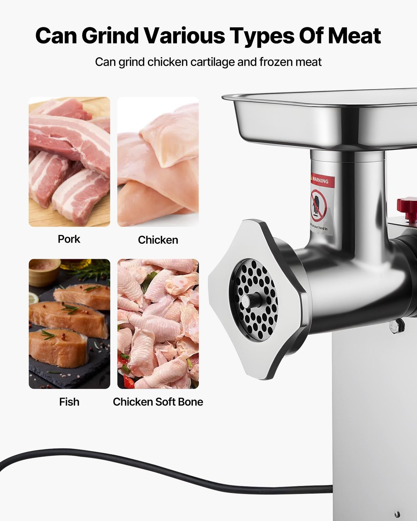 The electric meat grinder is made of carbon steel and stainless steel, with sharp SUS420 blades that are durable and capable of grinding chicken cartilage, frozen meat, and more