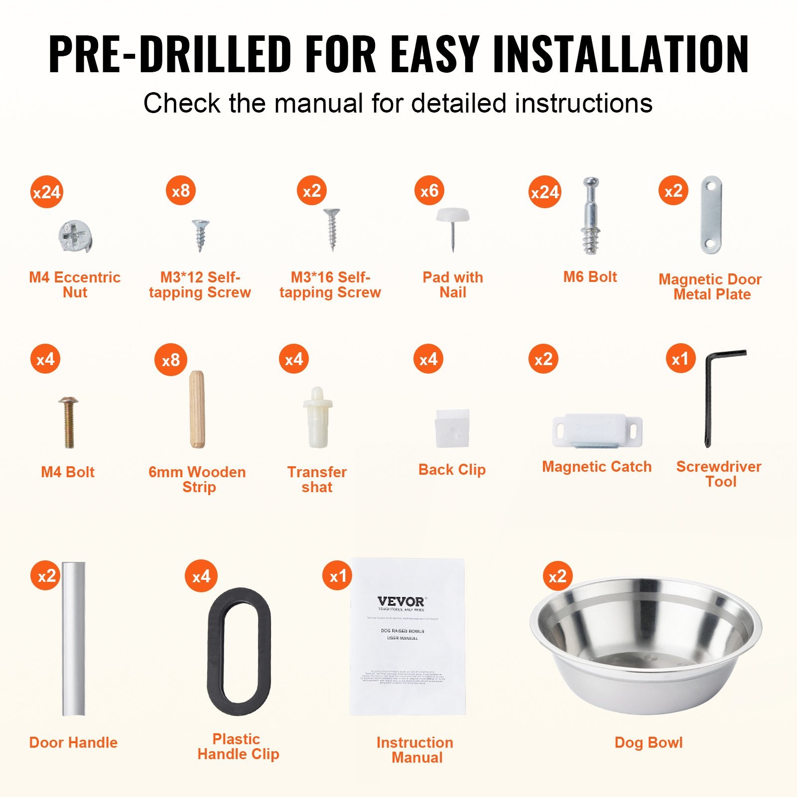 Dog Bowl x 2, M3 Self-tapping Screw x 8, M6 Bolt x 24, M4 Eccentric Nut x 24, M4 Screw x 4, Black Handle x 2 Pairs, Door Handle x 2, Wooden Strip x 8, Pad with Nail x 4, Magnetic Catch x 2 Sets, Instruction Manual x 1