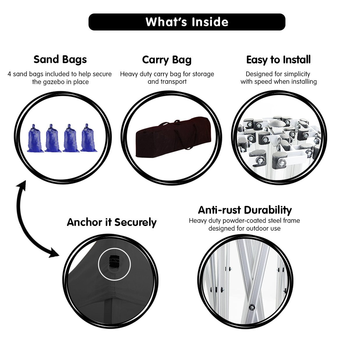 As well as the main unit and 5 walls this combo pack also comes with a handy carry bag and sandbags to help secure your marquee. And to make things a little easier our quality marquees are fitted with nylon inserts in the frame which eliminates frame jamming often experienced when erecting cheaper units.