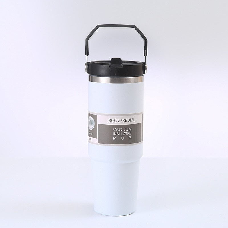 White 30oz 304 Stainless Steel Ice Cup with Handle - Portable Car and Travel Cup, Double Insulated, for Hot & Cold Drinks
