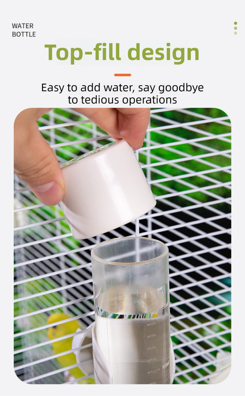- Top-Fill Design: Features a convenient flip-top lid, allowing you to refill water instantly from the top without removing the entire bottle from the cage.