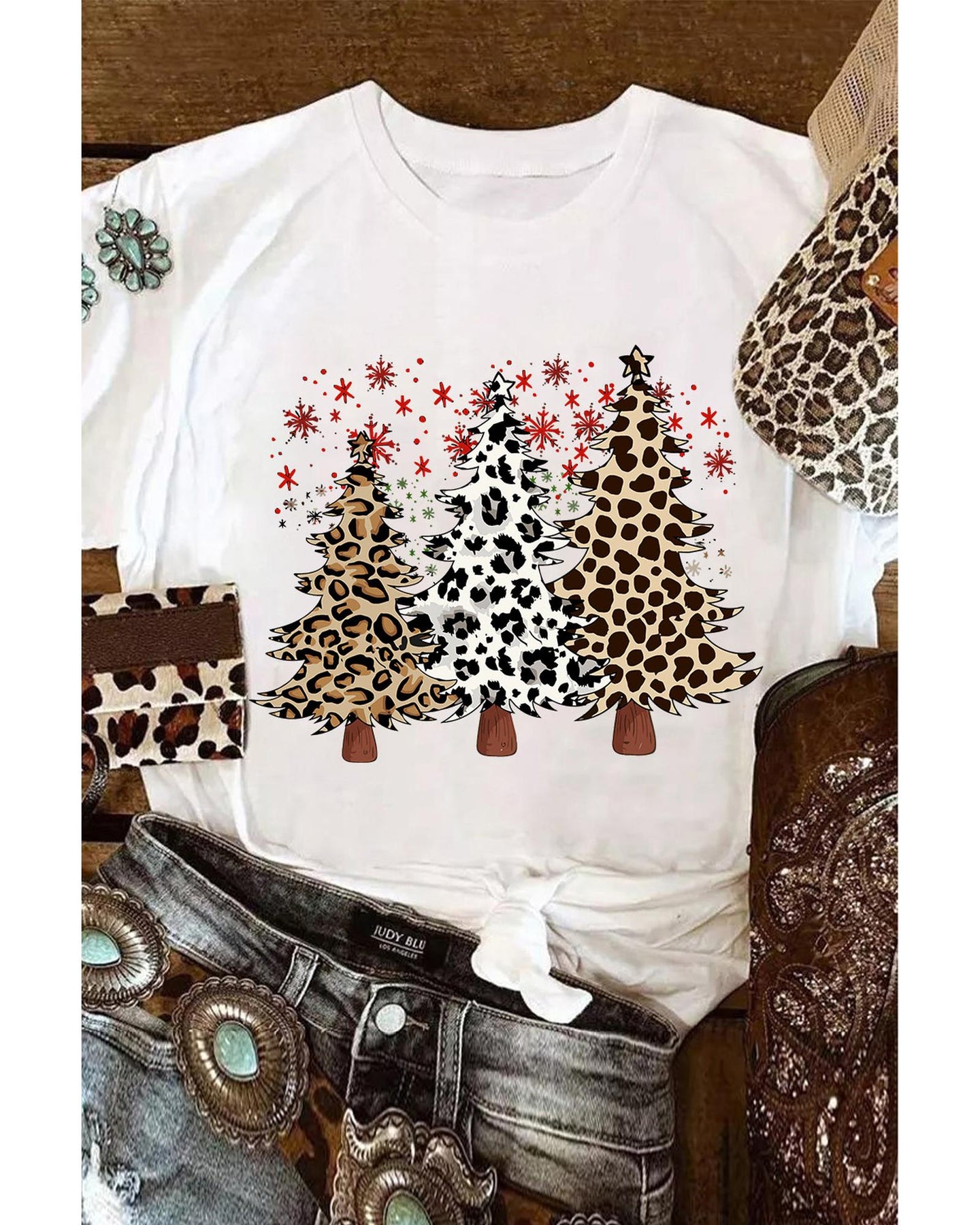 - White Leopard Christmas Tree Graphic Crewneck Tee