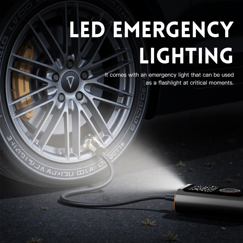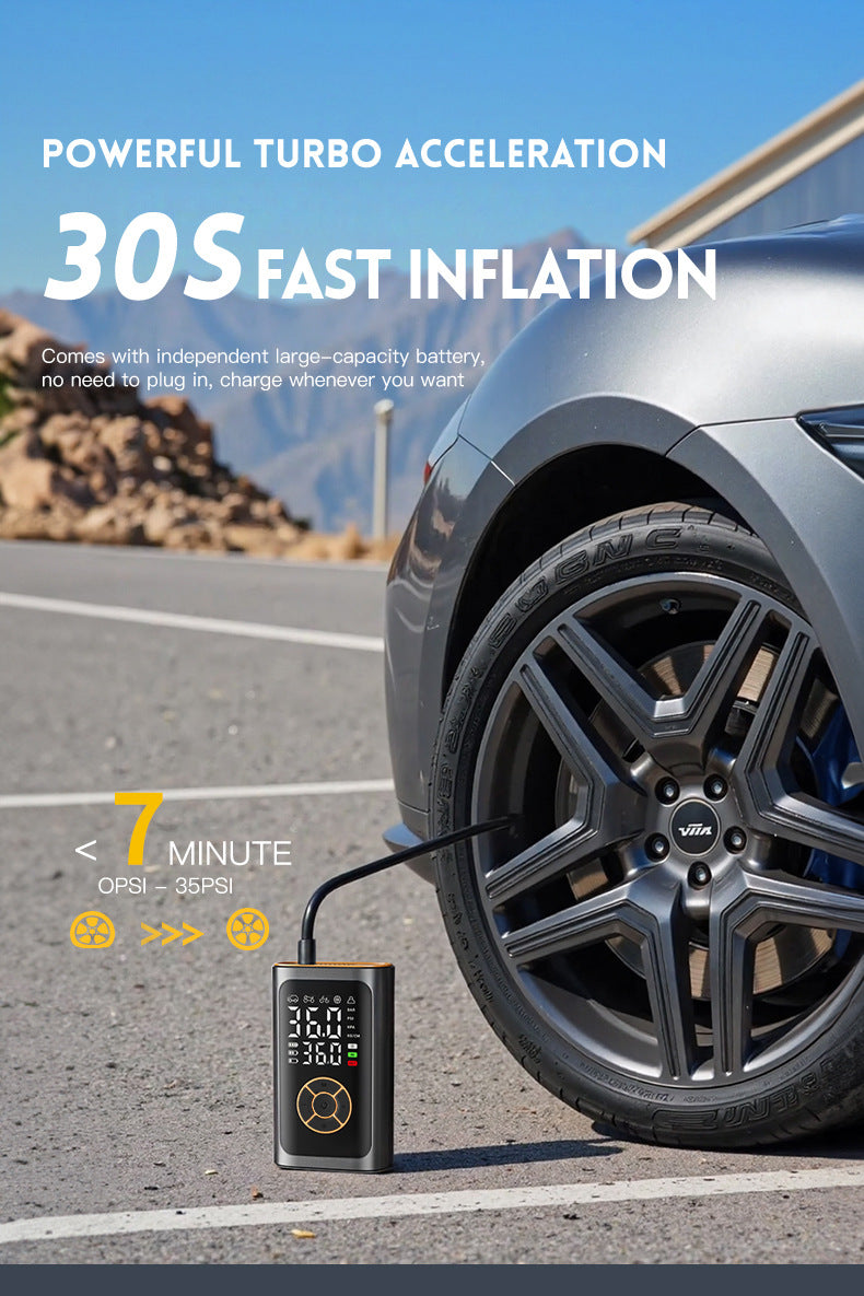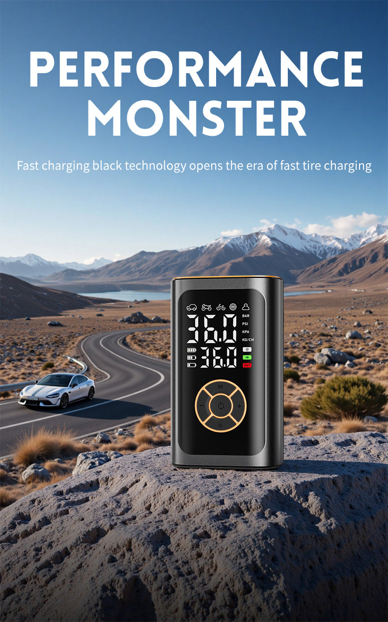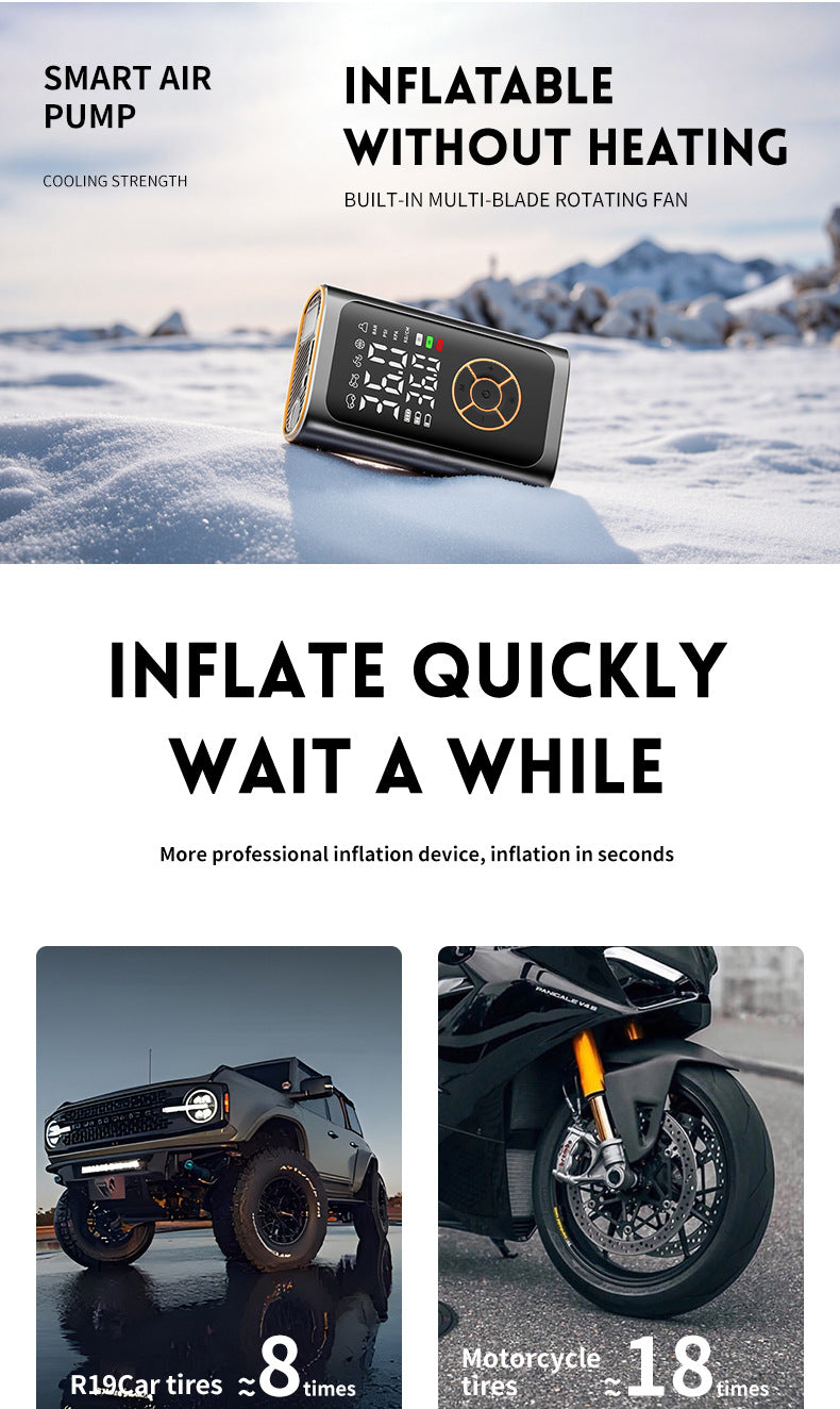 Stay on the road with confidence using this powerful wireless tire inflator designed for fast, accurate inflation. Equipped with a full-screen digital display and intelligent pressure control, it delivers precise results every timeperfect for cars, motorcycles, bicycles, sports balls, and more. Simply select your vehicle type from the 5 preset modes (car, motorcycle, bike, ball, custom) with one touch, and let the built-in smart chip do the rest. The device automatically shuts off when the target pressure is reached, preventing over-inflation and protecting your tires. With a high-efficiency 60W motor and dual LED screen, you can monitor real-time PSI, BAR, KPA, or kg/cm units with ease. Its compact and lightweight design makes it easy to store in your glove box, backpack, or trunkideal for daily commutes, long road trips, camping adventures, or emergency roadside use. Beyond inflation, this multi-function tool features a 3-mode LED flashlight (standard/SOS/flash) and a 5V/2A USB port to charge your phone or other devices. Whether you're on a highway, trail, or field, this all-in-one solution keeps you prepared. Includes: main unit, hose, 4 nozzles, Type-C cable, and user manual. A must-have for drivers, outdoor lovers, and families alike.