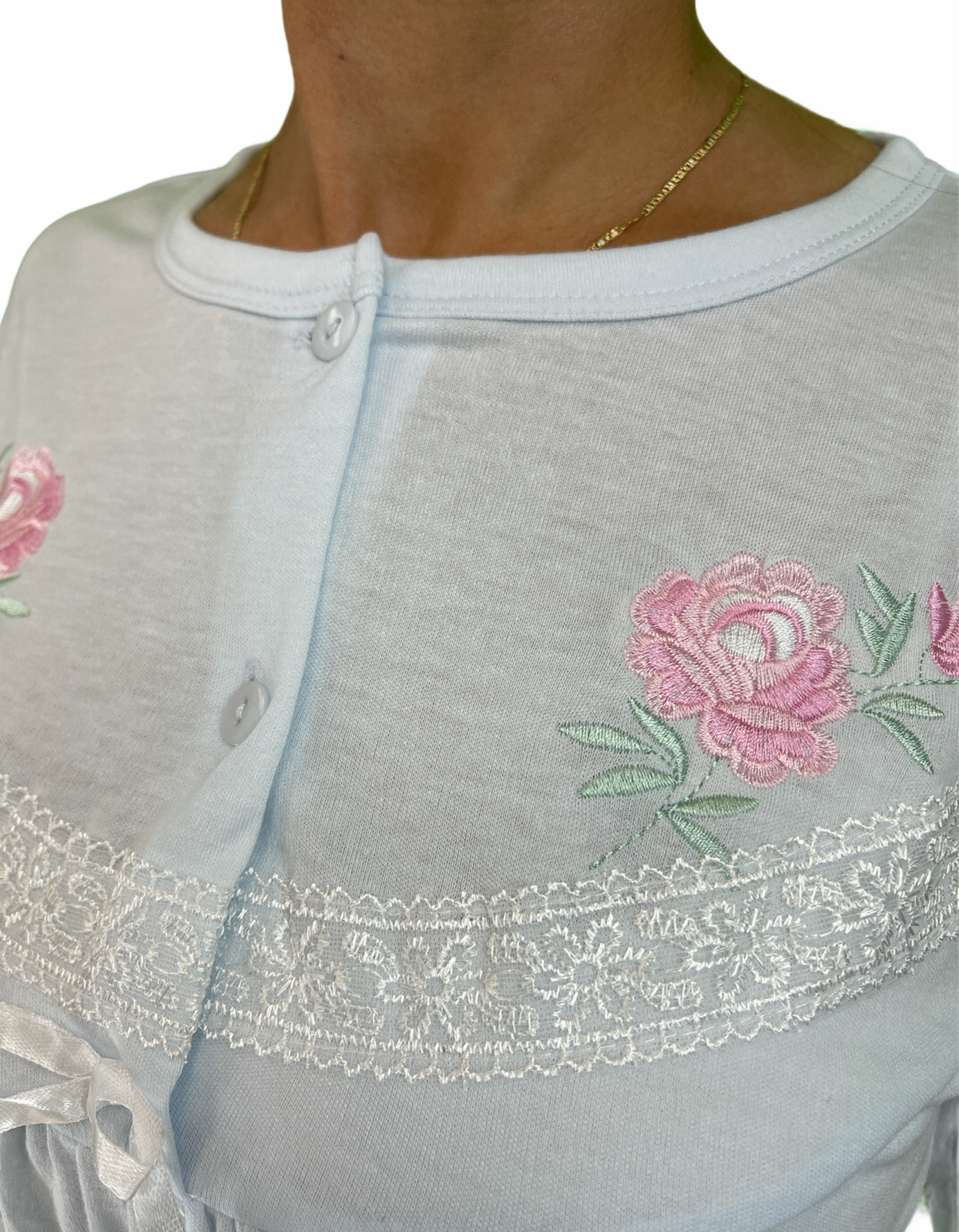 Made from soft cotton material, with embroidery and lace details.