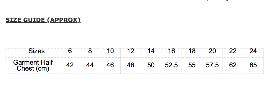 | Sizes | 6 | 8 | 10 | 12 | 14 | 16 | 18 | 20 | 22 | 24 |