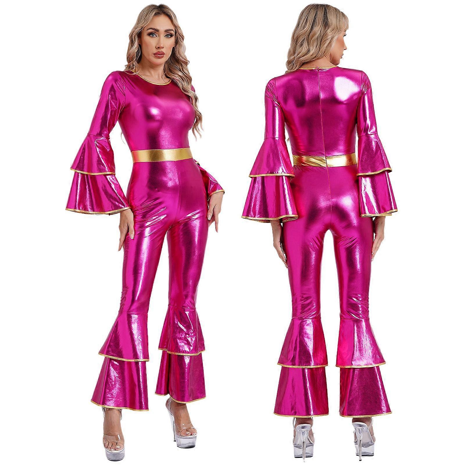 Size Length Chest Waist Hip Sleeve S 140cm 80cm 66cm 82cm 57.5cm M 142.5cm 85cm 71cm 87cm 58.5cm L 145cm 90cm 76cm 92cm 59.5cm XL 147.5cm 95cm 81cm 97cm 60.5cm XXL 150cm 100cm 86cm 102cm 61.5cm 3XL 152.5cm 105cm 91cm 107cm 62.5cm Washing instructions: Hand wash at 40°C or lower, do not bleach, do not iron. Label: Yes Set includes: 1 pc Jumpsuit Condition: New with label Material: 100% Polyester Features: Made of skin-friendly polyester with shiny surface, premium fabric is pill-free, breathable and soft, providing a better experience. A one-piece jumpsuit is designed with round neck, multi-layered flared sleeves and multi-layered flared legs, contrasting edges and back zipper. Metallic shiny surface adds unique luster, making you stylish and stand out. Flared and contrasting design makes you move with splendor. Styled with retro hippie, this jumpsuit is perfect for vintage 70s disco dance wear. You can pair it with tassel denim vest and high heels. Perfect for Halloween, masquerade, 60s/70s/80s disco costume, hippie dance, music festival, nightclub, carnivals, role play and other parties. Returns, Refunds and Replacements Products that are received faulty, damaged, or not as described are eligible for a return, refund, or replacement in accordance with the Australian Consumer Law (ACL). We are committed to ensuring all products meet the standards of quality and reliability expected by our customers. However, please note that we do not accept returns or provide refunds for change of mind. We encourage you to carefully consider your purchase to ensure it meets your needs and expectations. Delivery Timeframe Please note that we cannot guarantee the exact date of arrival, and the delivery timeframes (excluding weekends and public holidays) are as follows: For customers in Victoria, approximately 7-10 working days; For customers in NSW, SA, ACT, and QLD, approximately 9-12 working days; For customers in WA, NT, and TAS, approximately 9-12 working days.
