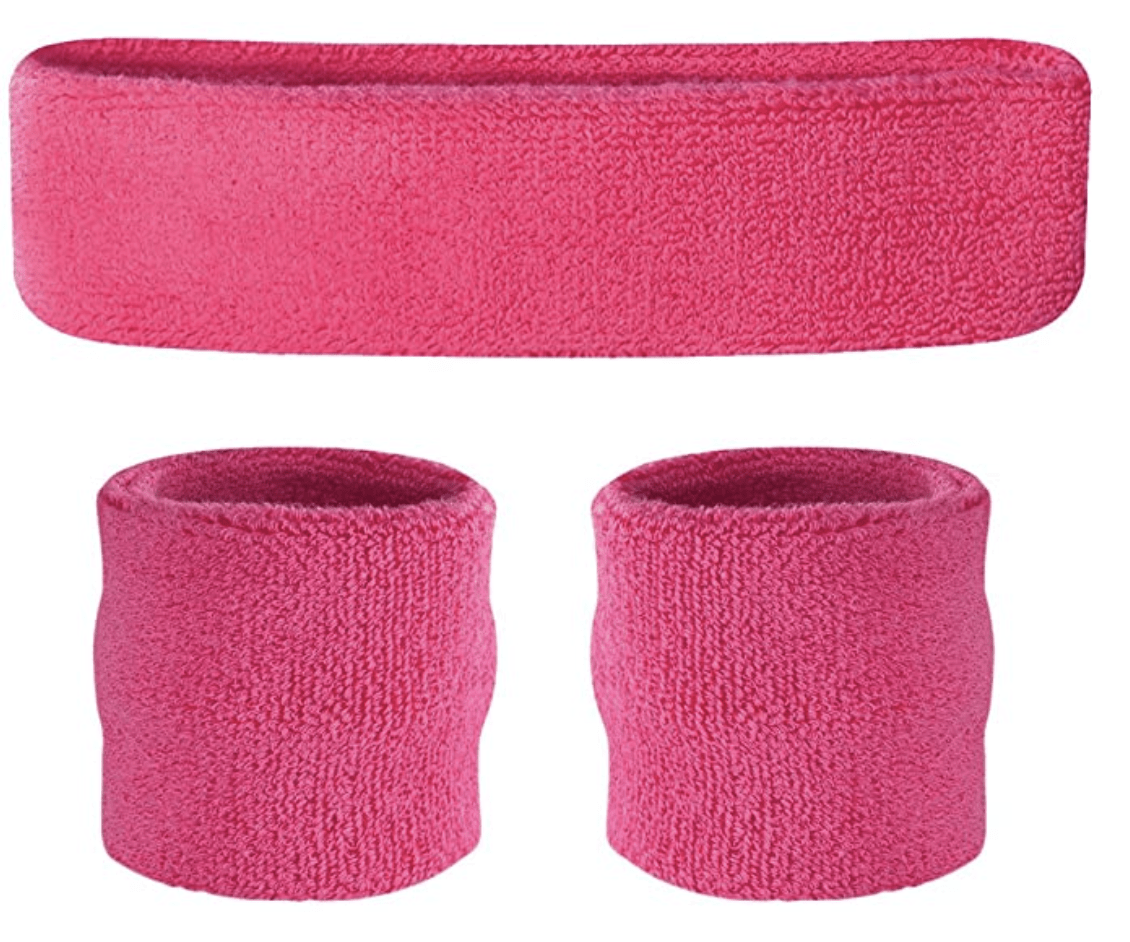 WRISTBAND & HEADBAND SET Tennis Terry Towelling Cotton Sweat Band Team Gym - Hot Pink