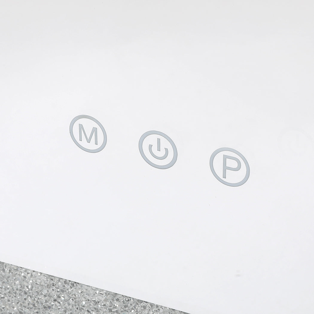 The exquisite crystal-inspired vanity mirror boasts a three-key touch-sensitive control panel that offers intuitive functionality for both light adjustment and color switching. The long press of the "P" button smoothly adjusts the brightness of the illumination, allowing for a personalized level of luminosity that ranges from a soft glow to a vibrant shine. The "M" button, on the other hand, cycles through three distinct color temperatures, providing the perfect lighting for makeup application, skincare routines, or even for simply admiring oneself.